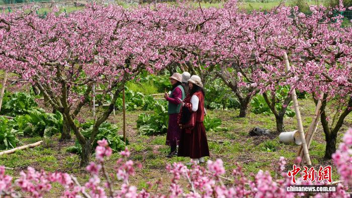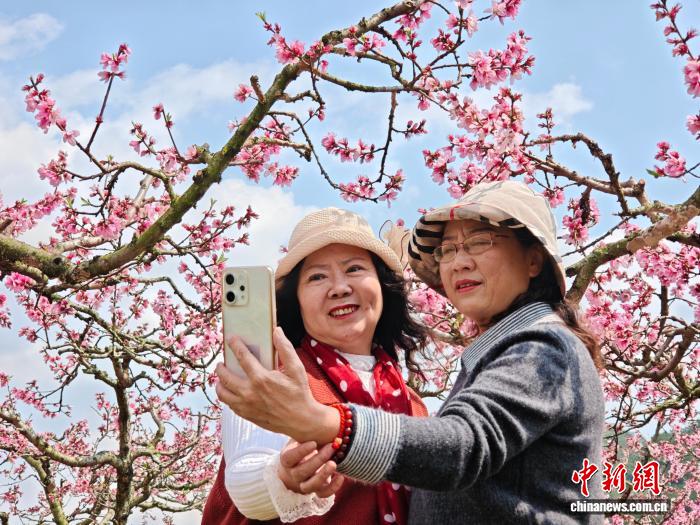 图为3月17日,搭客正在贵阳市北亮区永乐城的桃花林里摄影挨卡。石小杰 摄