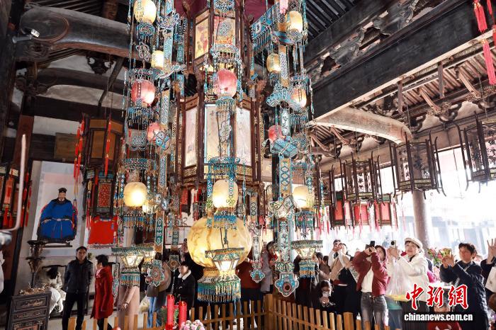 2月18日,正在浙江金华东阳卢宅景区,《卢宅千春·肃雍传脉》沉醉式剧目吸收了年夜批乘客前去旁观、玩耍。图为乘客围不雅宝盖索络联3散7彩穗羊角灯。 胡扬辉摄