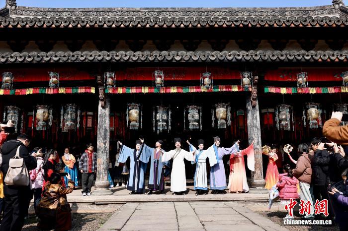 2月18日,正在浙江金华东阳卢宅景区,《卢宅千春·肃雍传脉》沉醉式剧目吸收了年夜批乘客前去旁观、玩耍。图为优伶取搭客互动。 胡扬辉摄